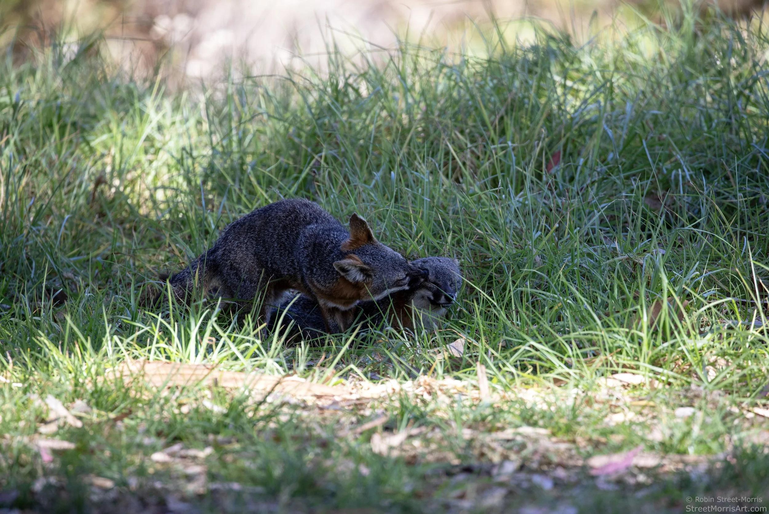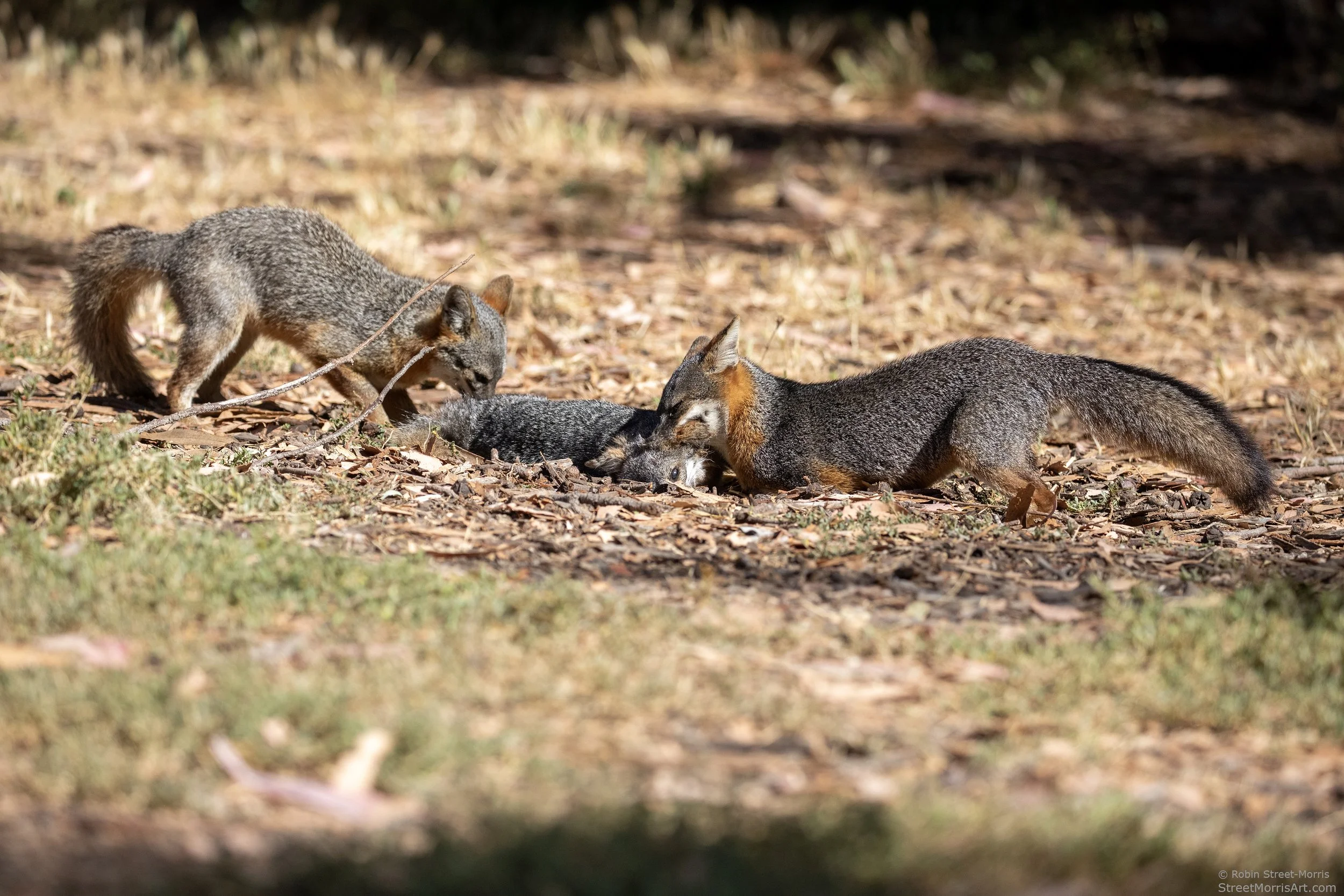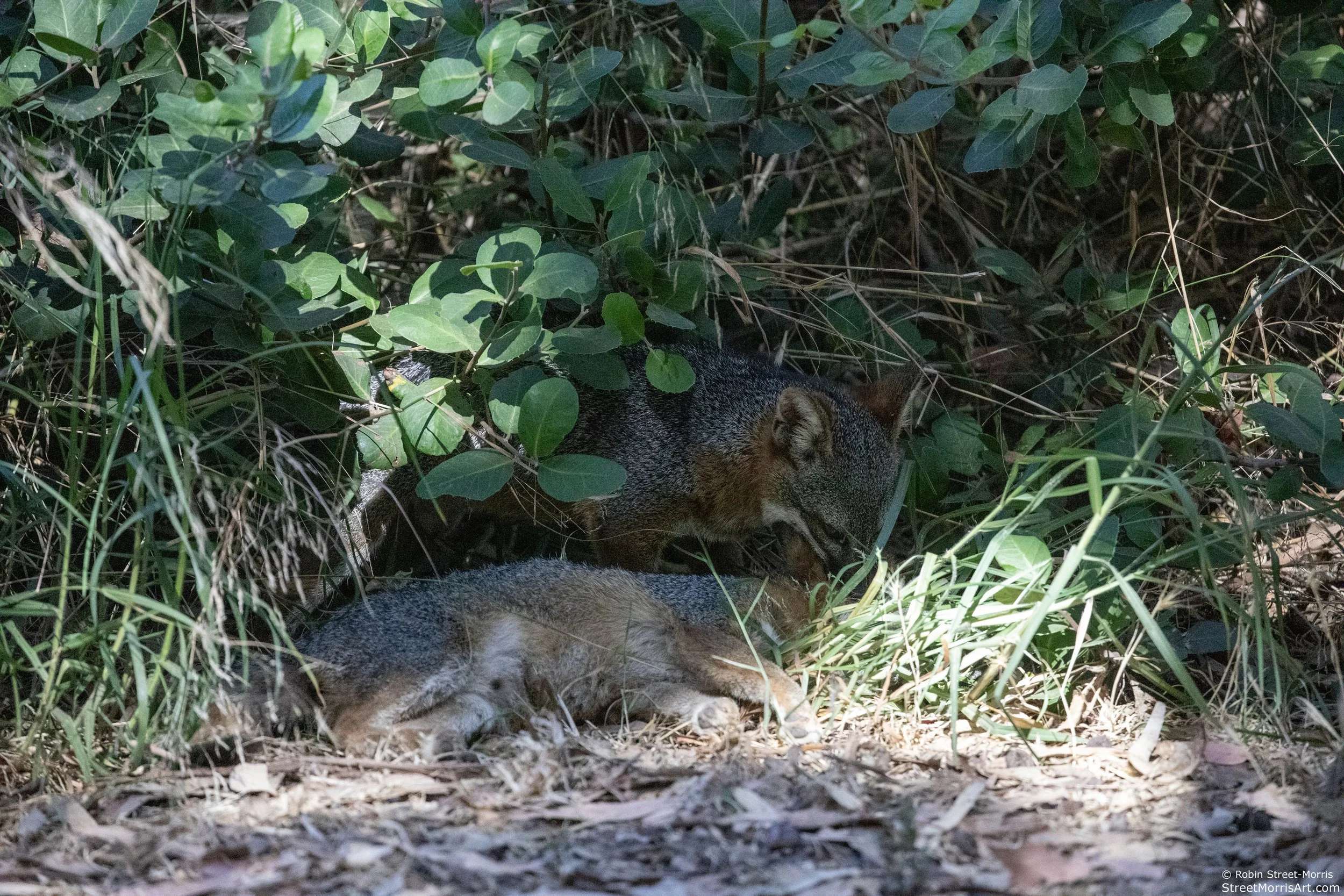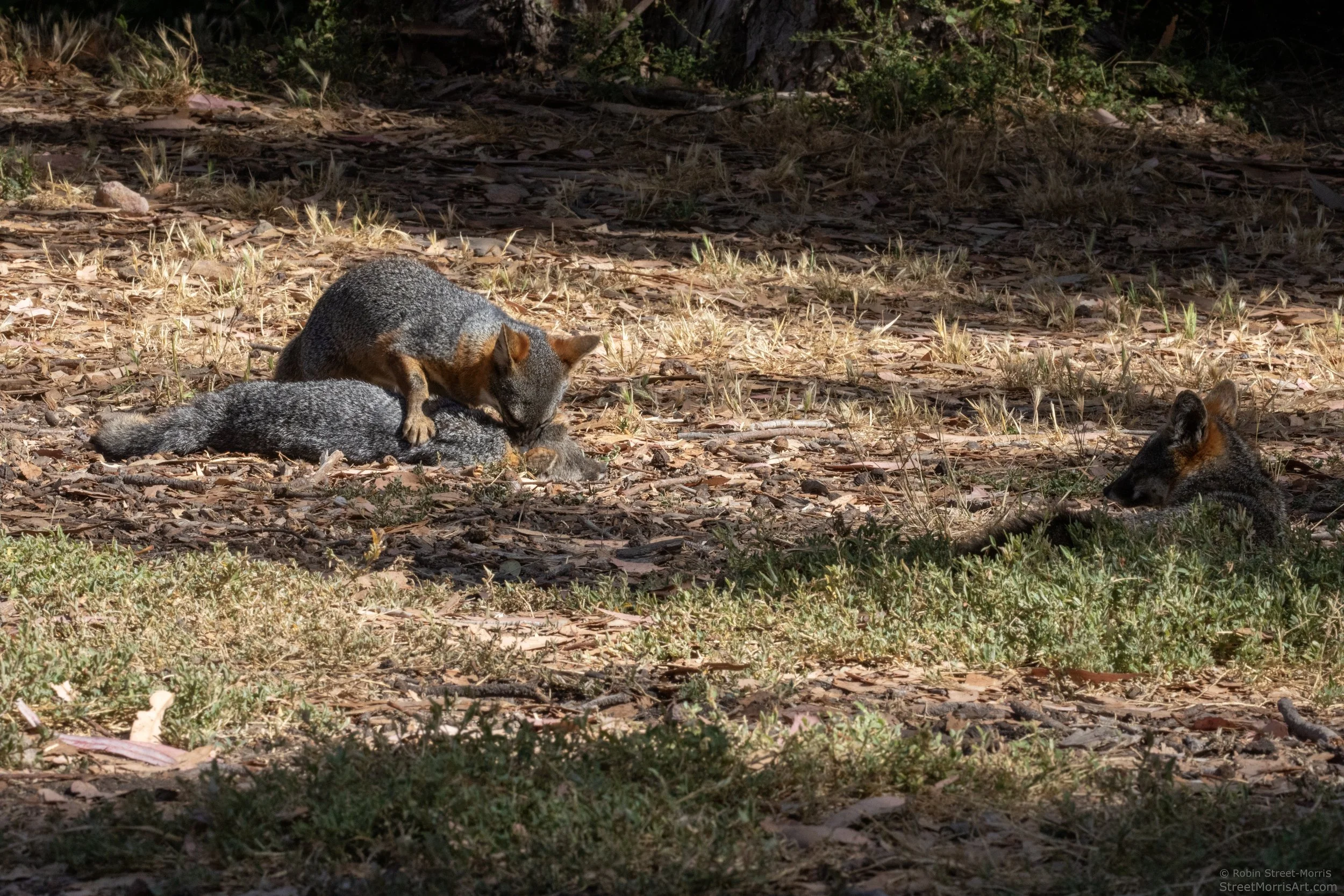 I've seen the Santa Cruz Island subspecies kill a snake, but never expected to see two foxes coordinate their efforts to do the same to another of their own species. Initially there were four foxes involved and one took off quickly thinking better of the decision to become involved for one reason or another. It was a flurry of activity with what appeared to be an older fox with floppy ears losing its life to one fox biting down on its neck and shaking while the other did the same with its tail and hindquarters. This happened as the floppy-eared fox was approaching the water spigot in Lower Scorpion Campground, so perhaps it was about guarding prime territory with a consistent water source and snacks that can be pilfered if not offered outright. I figured they were going to leave it for dead, but no. They began chewing on some of the most sensitive spots and ripping. One sat back in the grass watching and then rejoined the activity. The other fox then dragged its prey into a nearby lemonade berry and continued to pick at it. I’ve posted a bit of the footage I recorded here and it’s not for the faint of heart. Presumably the carcass was dragged further into the shrub because it was nowhere to be found when the ranger came to move it out of the way later that day and shared with campers present that this happens occasionally. If one is interested in these foxes past seeing one and thinking "awww!" (that's how the interest in them begins because they are beyond cute), this encounter raises a lot of questions. I'd seen them fight and retreat to lick their respective wounds. It's what animals do, humans included. I just hadn't pegged them for murdering their own species and cannibalizing them. It's been pretty dry which leads to there being less food for them, so were they extra hungry? None appeared malnourished, the victim included. There were other foxes foraging for plentiful insects and crunching away on them with a veritable Thanksgiving feast of beetles on our tent alone. Is dying in relative peace of injuries, disease and/or old age under a shrub the norm or does this happen more often than we know? A paper I read here showed fur rarely shows up in scat. Were either of these foxes related to the one they killed? On good terms with each other at one point? As scarring as this was, I’ve concluded it would be pointless and counterproductive for me to stop loving them because of what I saw. By that logic I would swear off all humans because we still kill each other sometimes for a litany of reasons that are either considered necessary or not depending upon one's perspective.